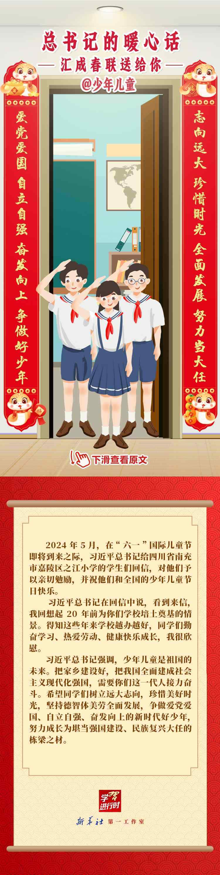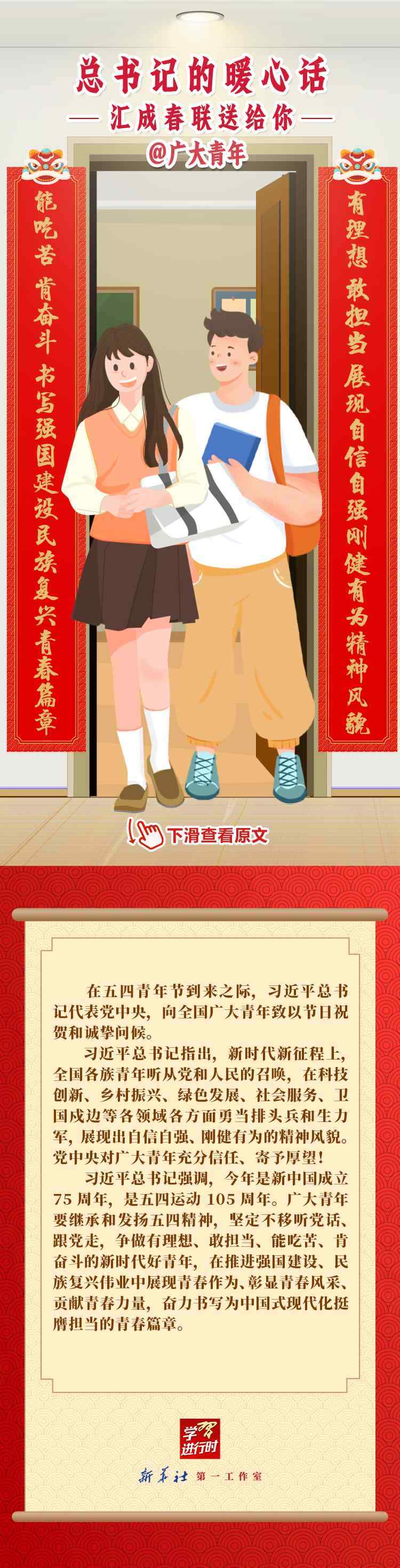 【學(xué)習(xí)進(jìn)行時】過春節(jié),貼春聯(lián),寄托人們對新年的美好愿望。過去一年,習(xí)近平總書記在不同場合點(diǎn)贊各行各業(yè)奮斗者,說了許多暖心話。新春之際,我們匯編成聯(lián),向新征程上的每一位“主角”致敬,送上新春的祝福。