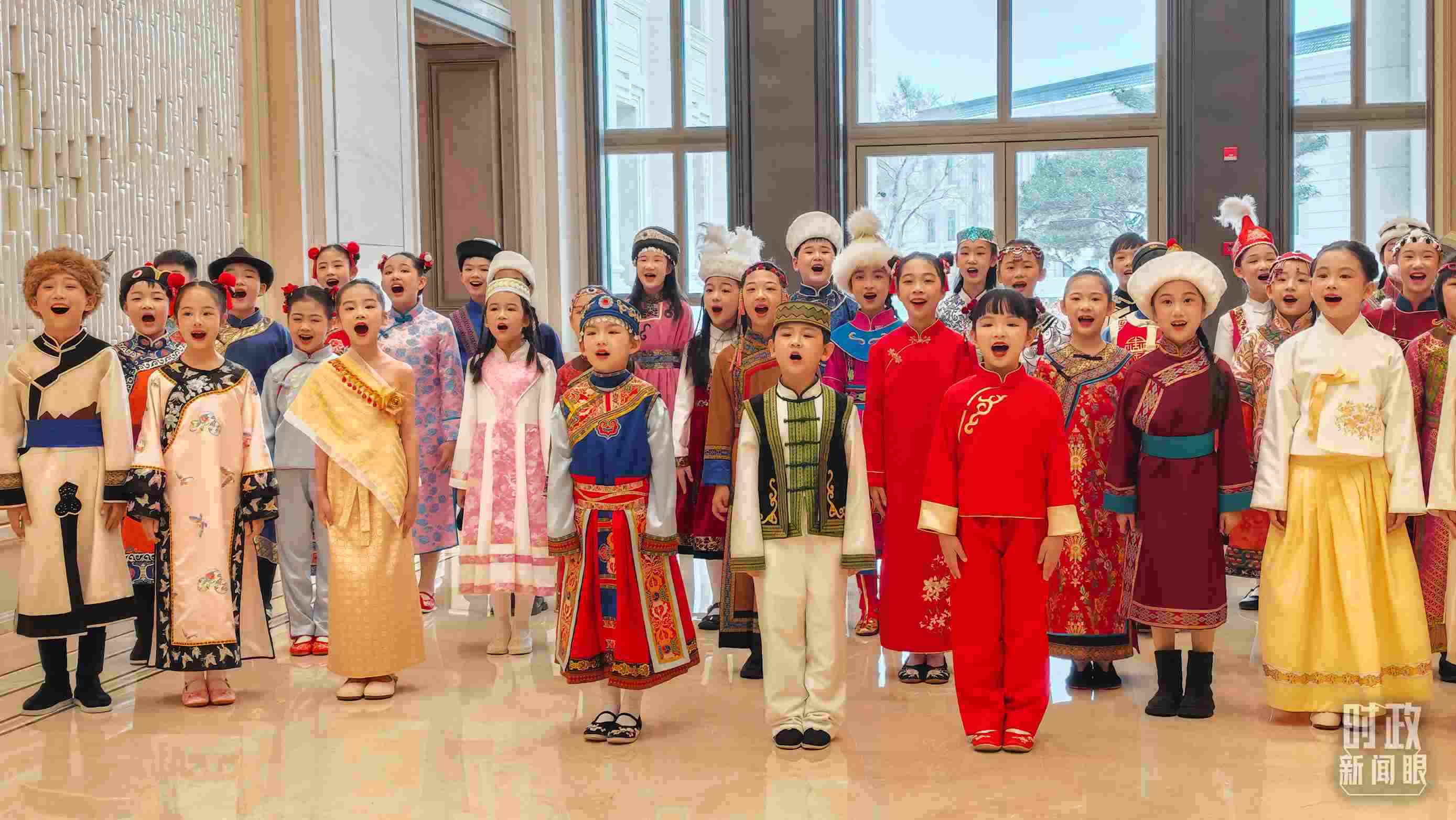 △歡迎宴會(huì)現(xiàn)場(chǎng),少年兒童正在合唱黑龍江民歌《烏蘇里船歌》。(總臺(tái)央視記者閆耀東拍攝)