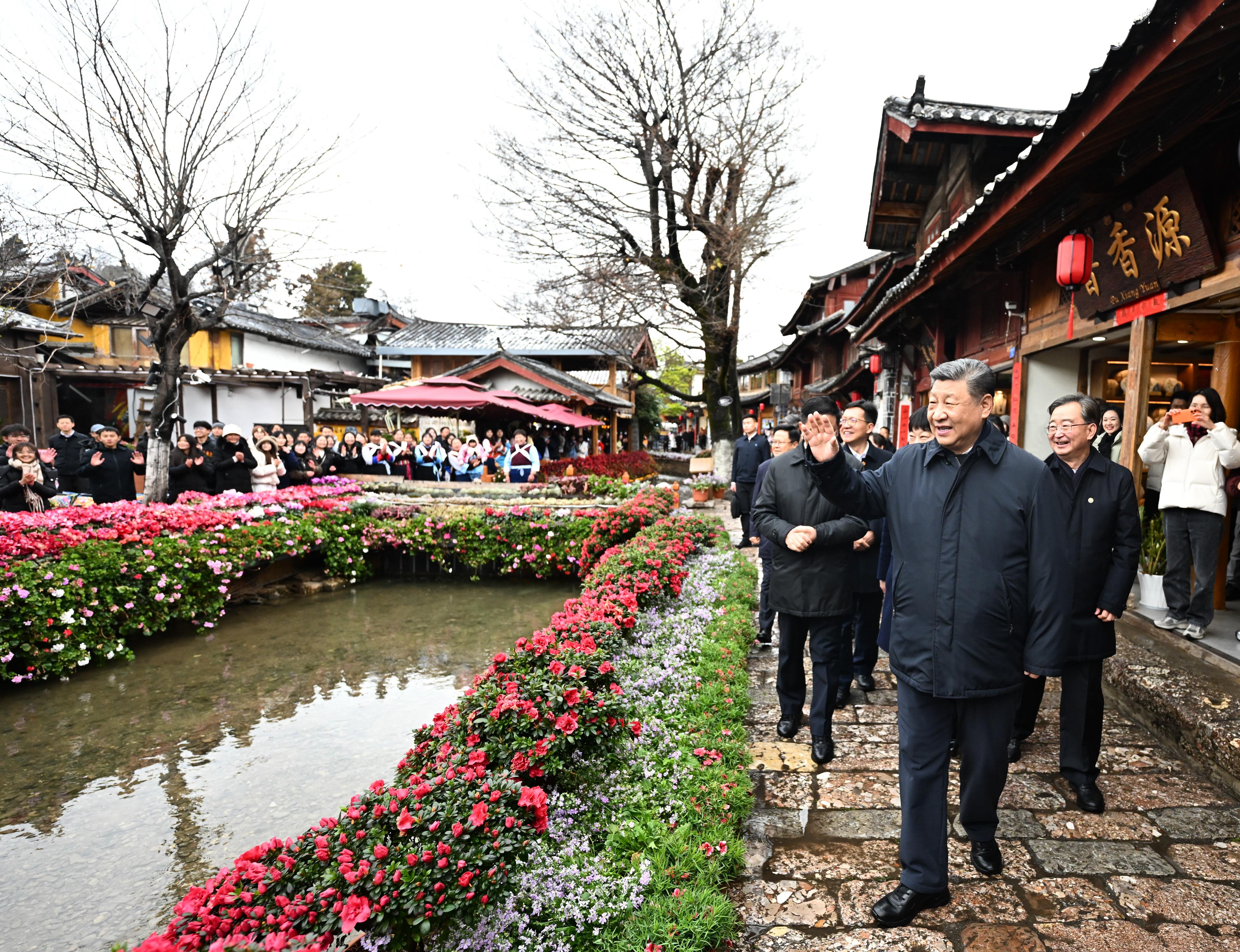 △2025年3月19日,習(xí)近平總書(shū)記在云南麗江古城考察時(shí),與居民、游客互動(dòng)交流。