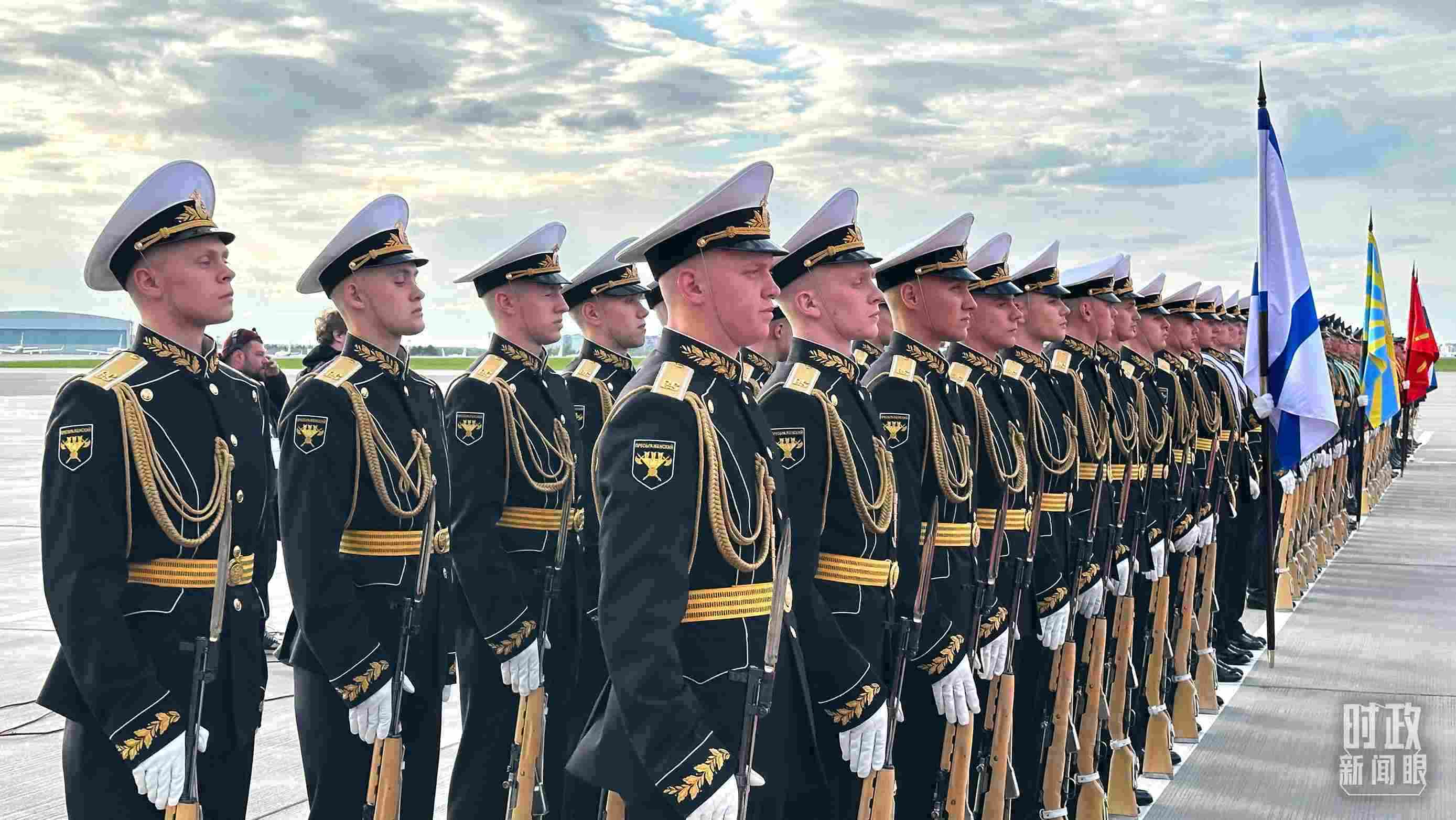 俄方在機(jī)場(chǎng)舉行隆重迎接儀式。軍樂團(tuán)奏中俄兩國(guó)國(guó)歌。習(xí)主席檢閱儀仗隊(duì)并觀看分列式。