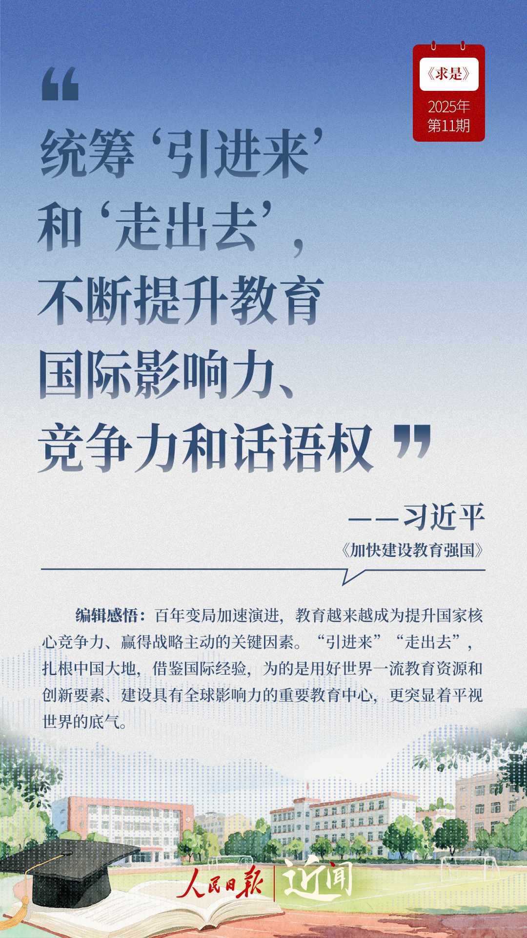教育是國之大計、黨之大計。日前,《求是》雜志發(fā)表習(xí)近平總書記重要文章《加快建設(shè)教育強國》?!叭姘盐战逃恼螌傩浴⑷嗣駥傩?、戰(zhàn)略屬性”“讓教育改革發(fā)展成果更多更公平惠及全體人民”“讓教師享有崇高社會聲望、成為最受社會尊重的職業(yè)之一”……通過這些話,一起感悟習(xí)近平總書記對教育強國建設(shè)的謀劃與部署。