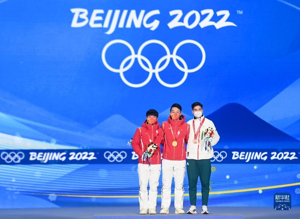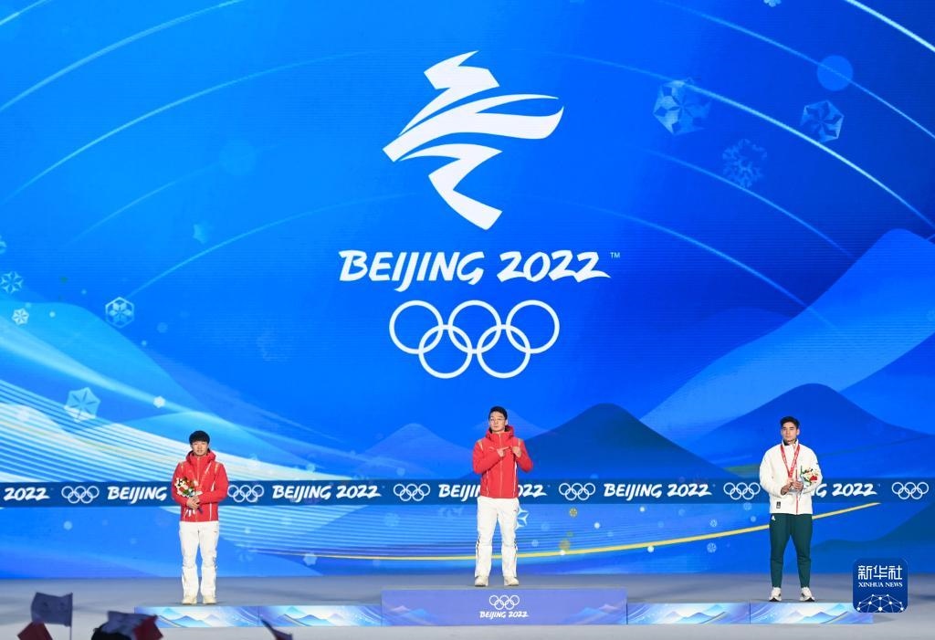 當(dāng)日,北京2022年冬奧會(huì)短道速滑男子1000米獎(jiǎng)牌頒發(fā)儀式在北京賽區(qū)頒獎(jiǎng)廣場舉行。