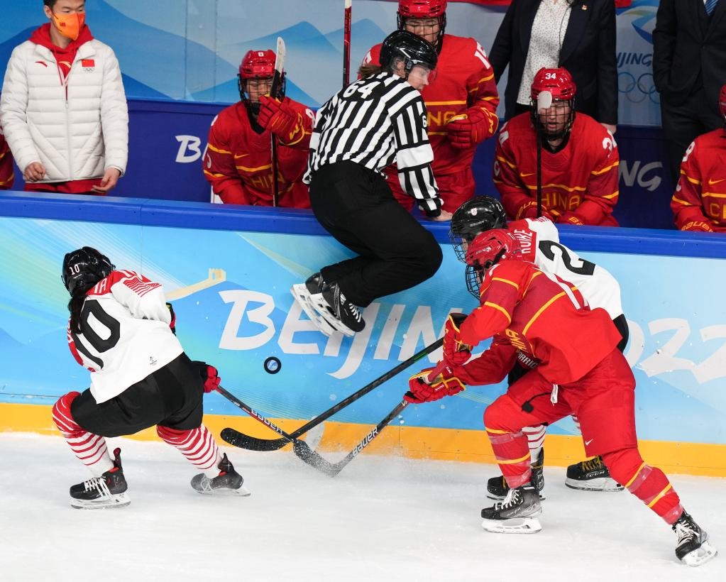 2月6日,中國(guó)隊(duì)球員張喜芳(右)在比賽中。新華社記者 孟永民 攝