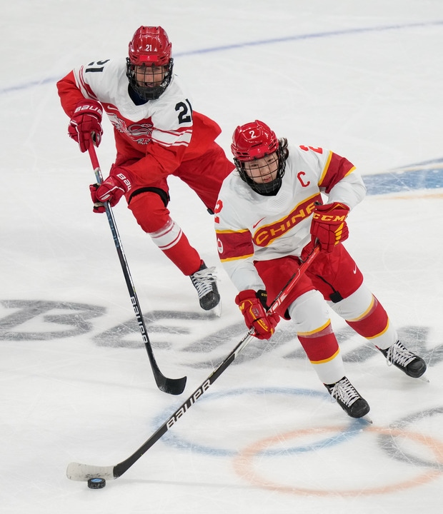 2月7日,中國(guó)隊(duì)球員張喜芳(左)與瑞典隊(duì)球員莉薩·約翰松(中)在比賽中拼搶。新華社記者孟永民攝