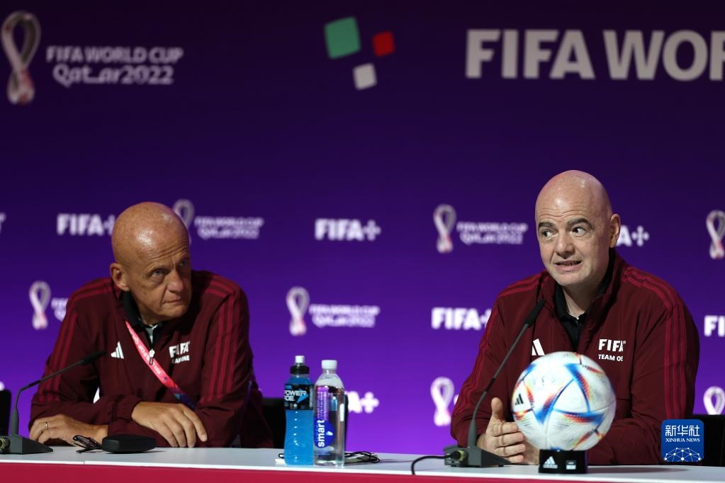 11月18日,國際足聯(lián)主席因凡蒂諾(右)與國際足聯(lián)裁判委員會主席皮耶路易吉·科利納在通氣會上。新華社記者 賈浩成 攝