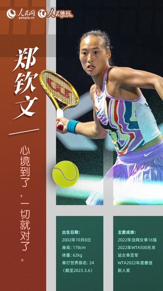 2022年,20歲的鄭欽文為中國女子網(wǎng)壇帶來驚喜。年初,她首次闖入澳網(wǎng)女單正賽并贏得首輪比賽,職業(yè)生涯首次亮相大滿貫正賽就取得開門紅。5月的法網(wǎng),鄭欽文打進女單第三輪,成為繼鄭潔、李娜和張帥之后第四位闖入法網(wǎng)16強的中國金花。此后的溫網(wǎng)和美網(wǎng)比賽,她都成功打進女單第三輪。