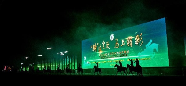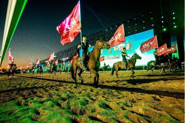 開幕式文體表演由《馬術方陣一馬當先》、歌伴舞《我的城我的馬》、《名馬展示策馬揚鞭》、《單馬技巧雙翼神馬》、《馬障礙秀躍馬揚鞭》、《馬術秀人馬合一》、歌伴舞《騎跡包頭》、《無人機秀馬上精彩》八塊內容組成。當晚的賽汗塔拉馬術賽場流光溢彩、氣氛熱烈,場內座無虛席、歡聲雷動。20時30分許,主騎手手持國旗,副騎手手持馬城旗幟,運動員方陣、民族方陣、女騎方陣、馬主方陣入場,騎手們精神飽滿、英姿颯爽,不時揮手致意,現(xiàn)場觀眾用熱烈的掌聲和歡呼聲,歡迎他們的到來。達茂旗9歲賽馬冠軍阿茹樂手持彩旗引出世界名馬亮相,40對人馬合一的“千古馬頌”表演震撼全場,1000架無人機躍然天空,點亮“騎跡包頭 馬上精彩”的字樣……藍天、碧水、凈土的包頭在策馬奔騰的馬術競技中拉開了“中國馬城”的壯麗畫卷。