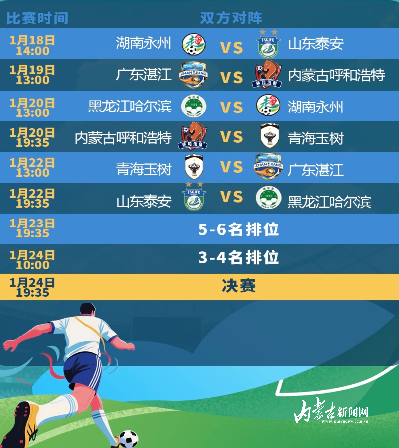 群眾足球風(fēng)云再起,一場匯聚南北、融合競技與文化的群眾足球盛宴即將激情上演。1月18日至1月24日,CMG群眾足球邀請(qǐng)賽將在湖南省永州市拉開帷幕。1月11日晚,抽簽結(jié)果正式揭曉,呼和浩特隊(duì)將于1月19日首戰(zhàn)粵超冠軍廣東湛江隊(duì)。球隊(duì)將于1月16日啟程,在永州進(jìn)行合練。
