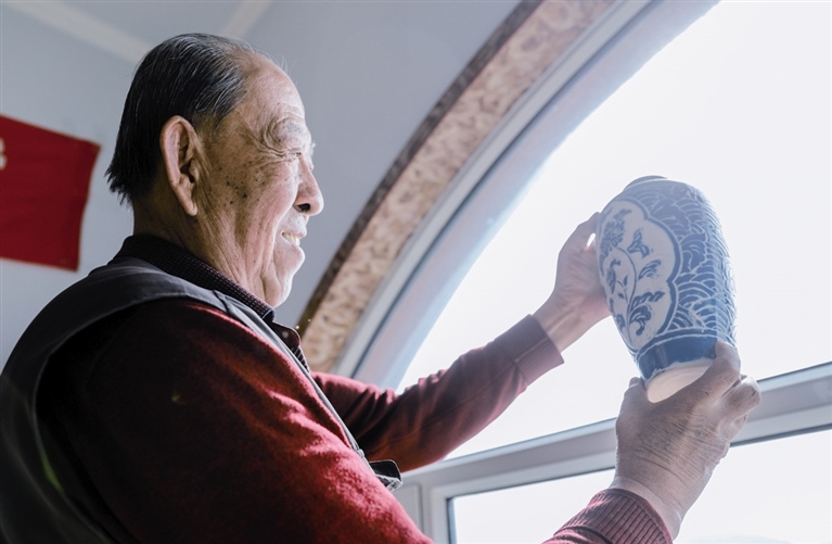 隨后,他走進“饅頭窯”旁邊的一口窯洞,這是當時張家的一間手工作坊,揉泥、拉坯、上釉等一系列制作陶瓷的工序都是在這里完成?!拔揖统錾谶@個村子,已經(jīng)是張家瓷藝的第九代傳人了。作為中國磁州窯譜系,清水河黑礬溝瓷藝生產(chǎn)歷史至少已有800年?!标P于這項非遺的歷史故事,張選老人向記者娓娓道來:大約400年前,他們張家走西口從山西來到清水河謀生,當時清水河黑礬溝有一家姓杜的人家做陶瓷營生,張家的先人在杜家打工,大概這樣打工做了三輩人吧,杜家忽然不做了,搬離了黑礬溝,他們張家便把杜家的產(chǎn)業(yè)買了下來繼續(xù)做?!澳莻€時候黑礬溝生產(chǎn)的瓷器都與人們生活息息相關,比如腌菜缸、水甕、碗盤等,一個家庭手工作坊一天能生產(chǎn)500個碗呢,生意很好,人們靠做這個營生也過上了不錯的生活。”張選回憶著清水河瓷藝鼎盛時期的場景。上個世紀70年代,由于交通、技術等原因,黑礬溝燃燒了幾百年的窯火熄滅,傳統(tǒng)“饅頭窯”被正式廢棄,轉(zhuǎn)移到窯溝鄉(xiāng)后手工作坊變成了機械化生產(chǎn),這也讓清水河的陶瓷名聲大噪。當時,在窯溝鄉(xiāng)一帶,從事陶瓷生產(chǎn)的有近萬人,陶瓷業(yè)成為清水河支柱產(chǎn)業(yè)。