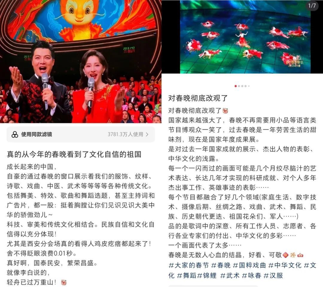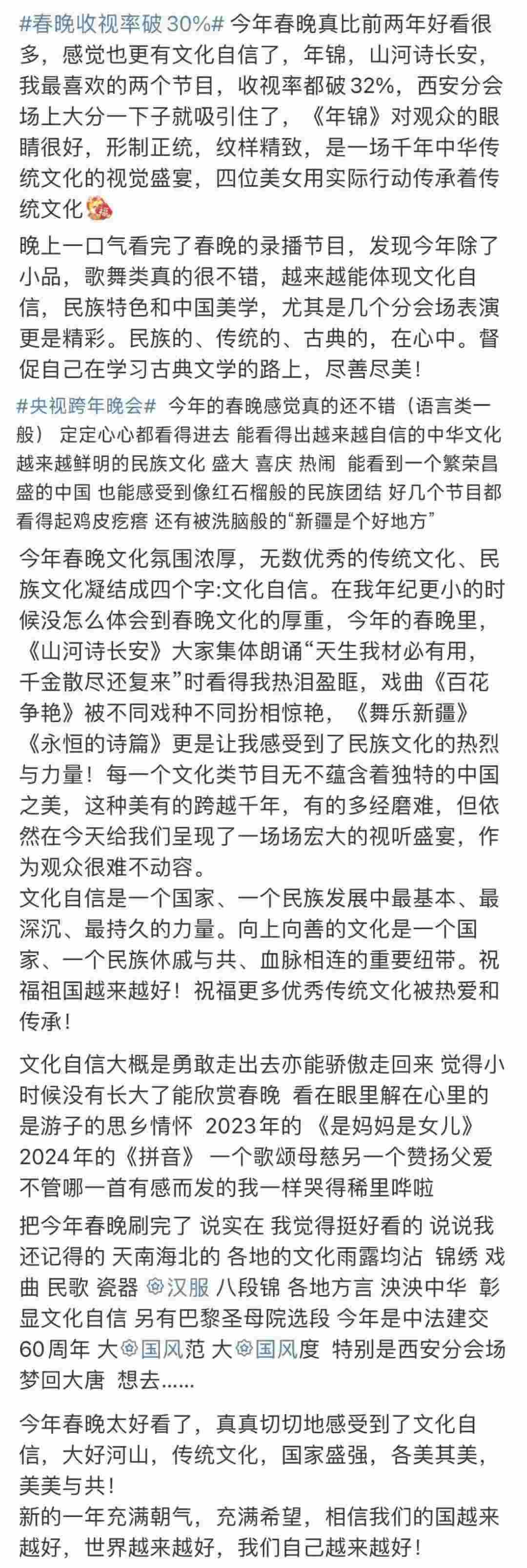 春晚的文化展現(xiàn),在國人中也引起了熱烈反響?!懊恳粋€(gè)文化類節(jié)目都蘊(yùn)含著獨(dú)特的中國之美,這種美有的跨越千年,有的多經(jīng)磨難,春晚給我們呈現(xiàn)了一場場宏大的視聽盛宴,作為觀眾很難不動(dòng)容”“從今年春晚真真切切地感受到了文化自信,大好河山,傳統(tǒng)文化,國家強(qiáng)盛,美美與共”“文化傳統(tǒng)特色給各個(gè)節(jié)目都刷了創(chuàng)意的漆,霸氣從節(jié)目中升騰,自信從感嘆中生發(fā),真妙”......