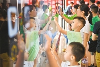 小朋友們在山西自然博物館電子屏前參與互動小游戲。新華社記者 楊晨光攝