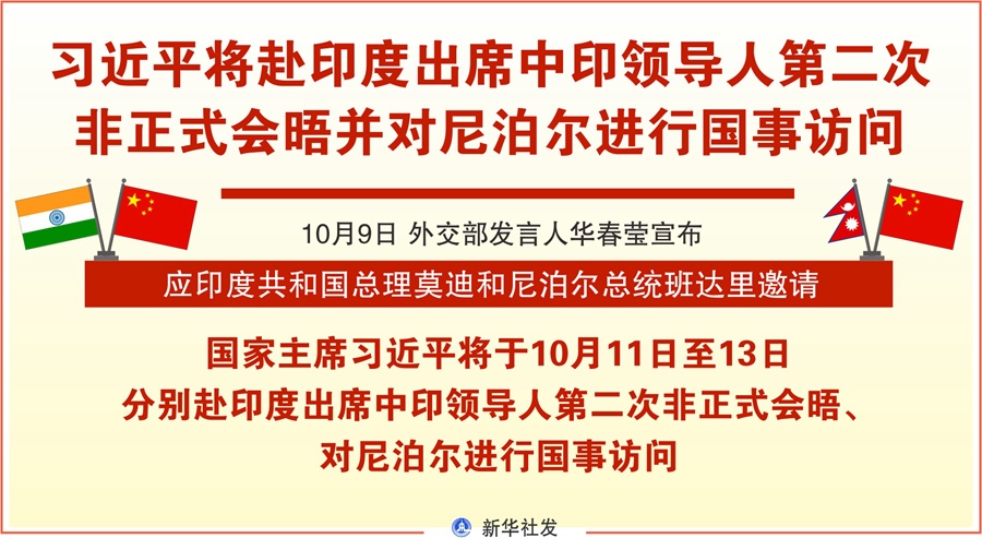 新華社北京10月9日電 外交部發(fā)言人華春瑩9日宣布:應(yīng)印度共和國(guó)總理莫迪和尼泊爾總統(tǒng)班達(dá)里邀請(qǐng),國(guó)家主席習(xí)近平將于10月11日至13日分別赴印度出席中印領(lǐng)導(dǎo)人第二次非正式會(huì)晤、對(duì)尼泊爾進(jìn)行國(guó)事訪問(wèn)。