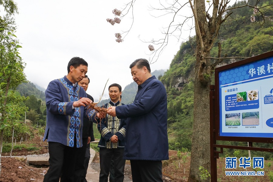 這是4月15日下午,習近平在石柱土家族自治縣中益鄉(xiāng)華溪村了解該村通過種植中藥材黃精等特色經濟作物帶動村民脫貧的情況。 新華社記者 鞠鵬 攝