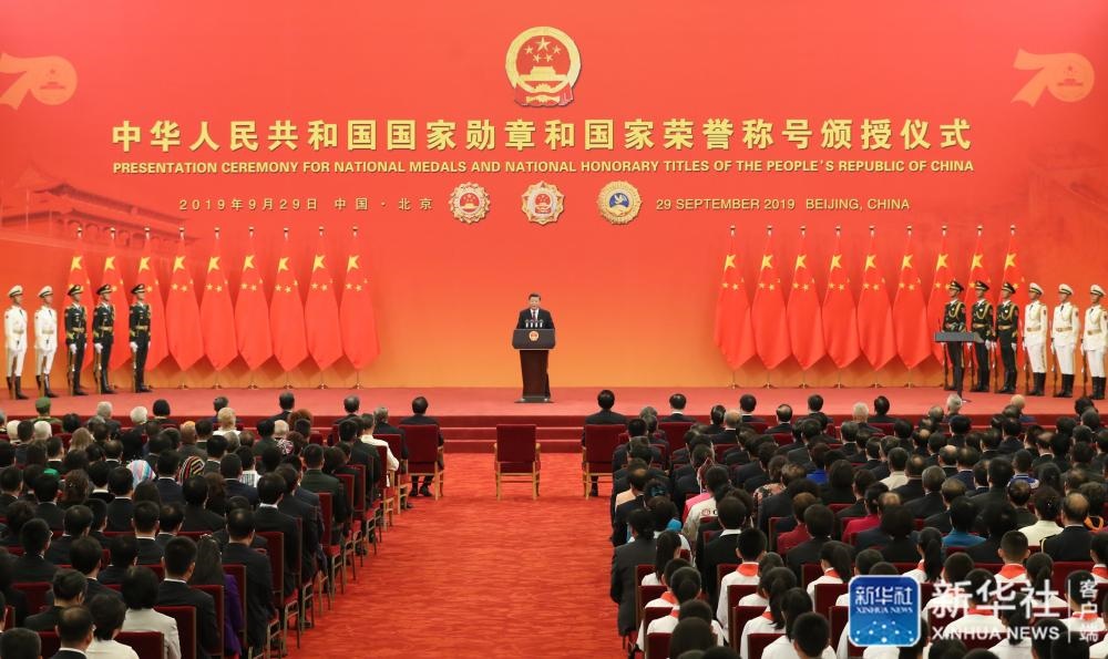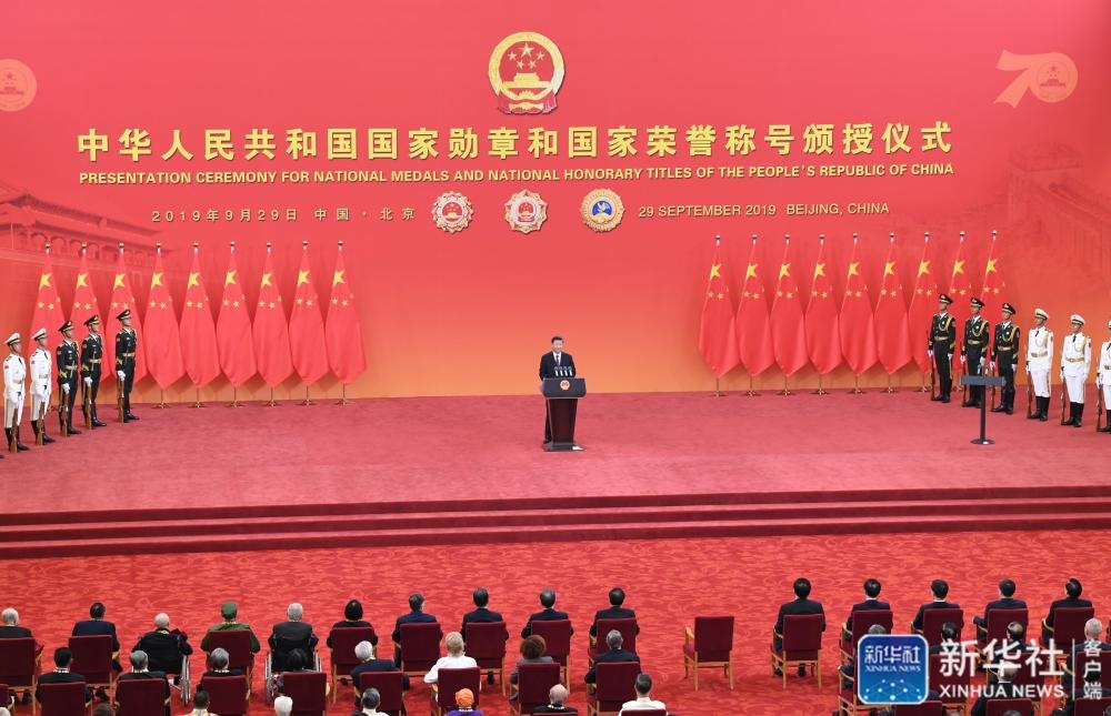 ↑9月29日,中華人民共和國(guó)國(guó)家勛章和國(guó)家榮譽(yù)稱(chēng)號(hào)頒授儀式在北京人民大會(huì)堂金色大廳隆重舉行。中共中央總書(shū)記、國(guó)家主席、中央軍委主席習(xí)近平向國(guó)家勛章和國(guó)家榮譽(yù)稱(chēng)號(hào)獲得者頒授勛章獎(jiǎng)?wù)虏l(fā)表重要講話。新華社記者黃敬文攝