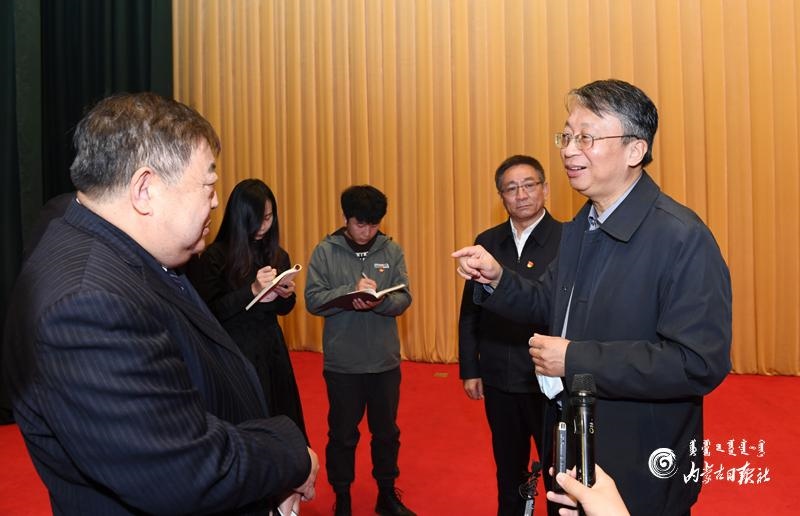 11月8日上午,在學(xué)習(xí)貫徹黨的十九屆五中全會精神中央宣講團(tuán)內(nèi)蒙古報告會結(jié)束后,聆聽報告會的部分人員與宣講人沈春耀互動交流。內(nèi)蒙古日報記者 袁永紅 攝