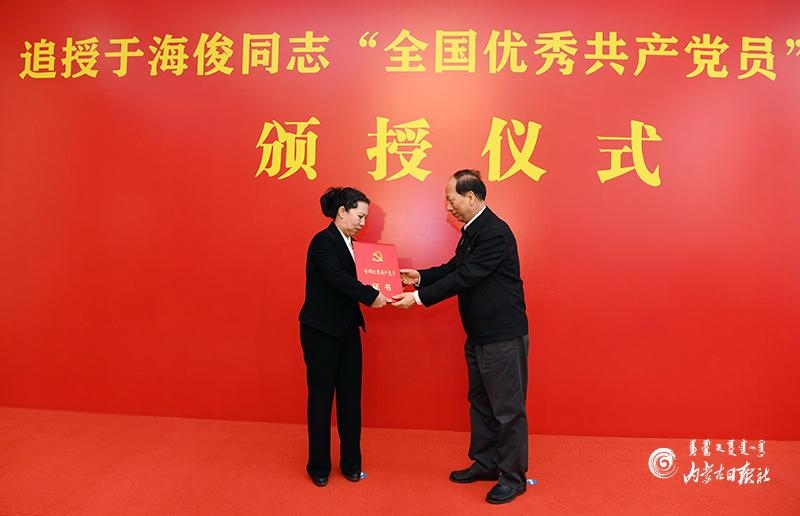 12月23日,自治區(qū)黨委書記、人大常委會(huì)主任石泰峰向于海俊同志家屬劉文慶頒授“全國(guó)優(yōu)秀共產(chǎn)黨員”獎(jiǎng)?wù)?、證書。內(nèi)蒙古日?qǐng)?bào)記者 袁永紅 攝