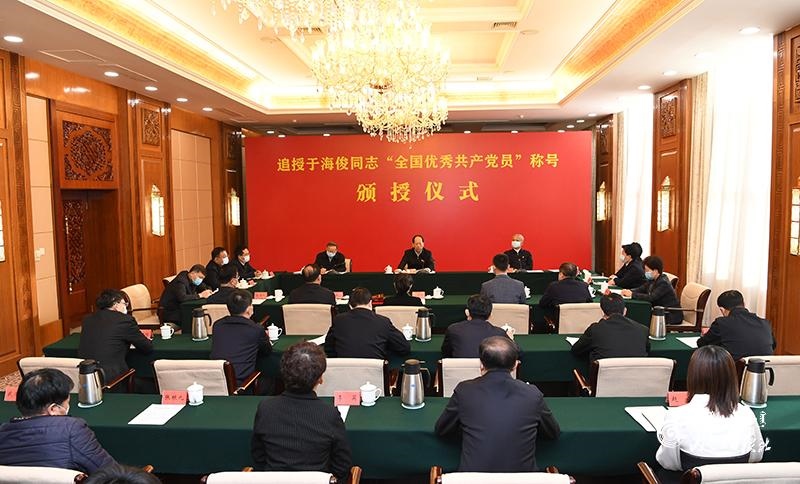 12月23日,受中央組織部委托,自治區(qū)黨委在呼和浩特舉行追授于海俊同志“全國(guó)優(yōu)秀共產(chǎn)黨員”稱號(hào)頒授儀式。自治區(qū)黨委書記、人大常委會(huì)主任石泰峰向于??⊥炯覍兕C授獎(jiǎng)?wù)伦C書并講話,號(hào)召全區(qū)廣大黨員干部深入學(xué)習(xí)于??⊥鞠冗M(jìn)事跡,以英雄為鏡、向模范對(duì)標(biāo),在本職崗位上展現(xiàn)共產(chǎn)黨人應(yīng)有的責(zé)任擔(dān)當(dāng),為推動(dòng)現(xiàn)代化內(nèi)蒙古建設(shè)作出更大貢獻(xiàn)。自治區(qū)黨委常委、組織部部長(zhǎng)楊偉東主持頒授儀式,并宣讀《中共中央關(guān)于授予周永開、張桂梅同志和追授于海俊、李夏、盧永根、張小娟、加思來(lái)提·麻合蘇提同志“全國(guó)優(yōu)秀共產(chǎn)黨員”稱號(hào)的決定》。自治區(qū)黨委常委、秘書長(zhǎng)、自治區(qū)常務(wù)副主席張韶春出席。于??⊥炯覍賱⑽膽c,內(nèi)蒙古森工集團(tuán)黨委書記、董事長(zhǎng)陳佰山,根河林業(yè)局防火管理處森防大隊(duì)副大隊(duì)長(zhǎng)范紀(jì)東分別發(fā)言,他們以親身經(jīng)歷和切身感受,滿懷深情地追述了于??⊥镜南冗M(jìn)事跡和感人故事。
