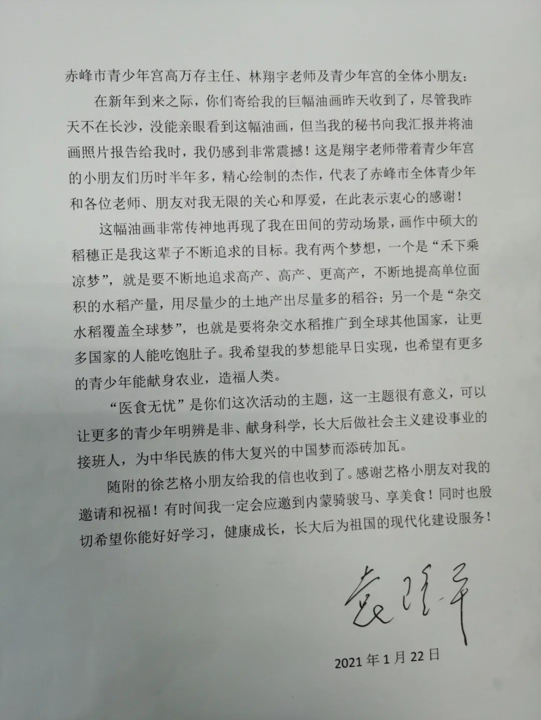 “袁隆平院士在百忙之中抽出寶貴時(shí)間給赤峰市青少年宮和孩子們回信,令我們始料未及,這封信我們反復(fù)讀了很多遍。深受感動?!背喾迨星嗌倌陮m副主任高萬存深有感觸的說,90歲高齡的袁隆平院士依然孜孜不倦的追求自己的兩個(gè)夢想,并一直在為之不懈的奮斗,這種崇高的精神品質(zhì)值得當(dāng)代青年學(xué)習(xí)。袁隆平院士在信中對赤峰市青少年宮推出的“醫(yī)食無憂”的主題教育活動給予了充分肯定,并寄語赤峰市青少年好好學(xué)習(xí),長大后為祖國的現(xiàn)代化建設(shè)服務(wù),激勵著孩子們刻苦學(xué)習(xí),為夢想努力拼搏,將來成為一名對社會有所貢獻(xiàn)的人。歡迎并期待袁隆平院士來內(nèi)蒙古品嘗美食,感受大草原的美麗風(fēng)光。