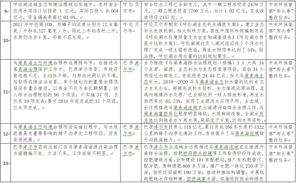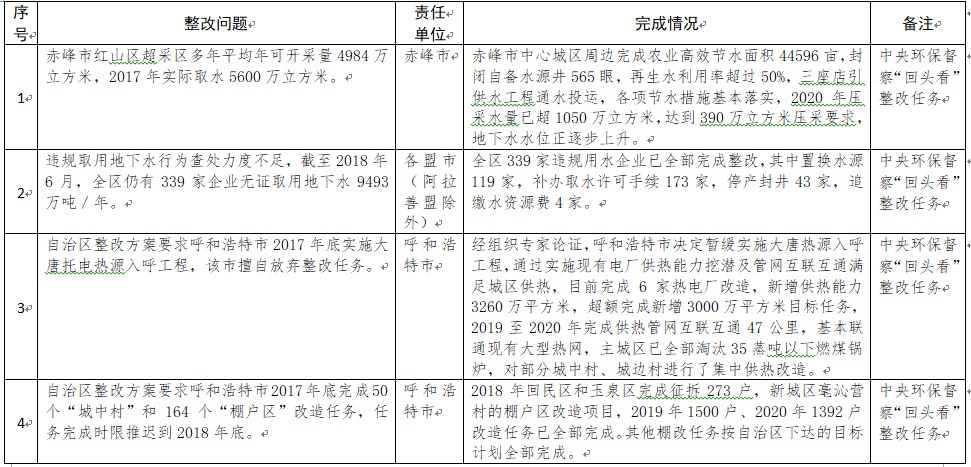中央環(huán)境保護(hù)督察以來(lái),自治區(qū)各級(jí)黨委政府及相關(guān)部門(mén)高度重視反饋意見(jiàn)整改工作,貫徹落實(shí)習(xí)近平生態(tài)文明思想的自覺(jué)性和主動(dòng)性顯著增強(qiáng),采取強(qiáng)有力措施積極推動(dòng)整改工作,整改工作取得階段性成果。近期部分整改任務(wù)已通過(guò)自治區(qū)相關(guān)委辦廳局驗(yàn)收,現(xiàn)予以公示,公示期2021年2月5日至2月9日,未提出異議的整改任務(wù)給予銷(xiāo)號(hào)(聯(lián)系電話(huà):0471-4632171)。