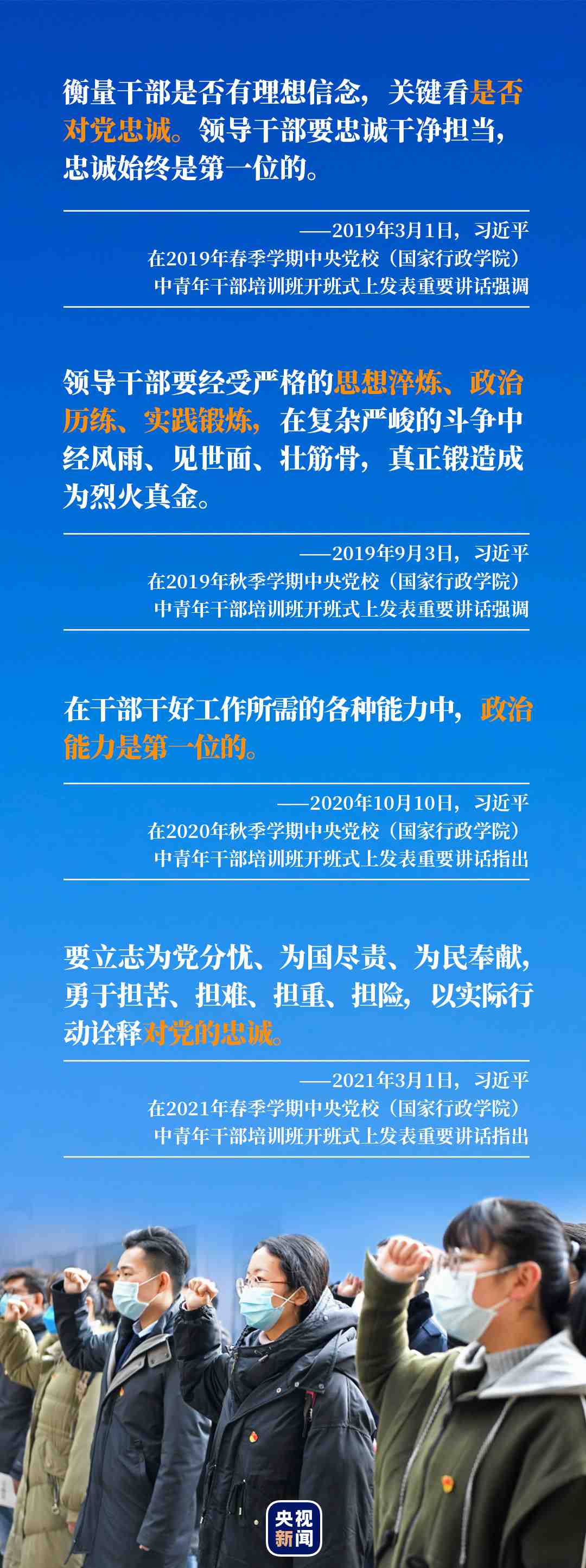 對(duì)黨忠誠(chéng)、提高政治能力是總書(shū)記在近幾年中青年干部培訓(xùn)班開(kāi)班式上授課的關(guān)鍵詞。