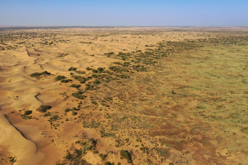 牧民寶音德力格爾家附近的庫布其沙漠(無人機照片)。新華社記者 李志鵬攝