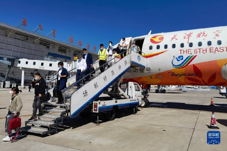旅客乘坐航班從呼和浩特抵達(dá)錫林浩特機(jī)場。新華社記者李云平攝