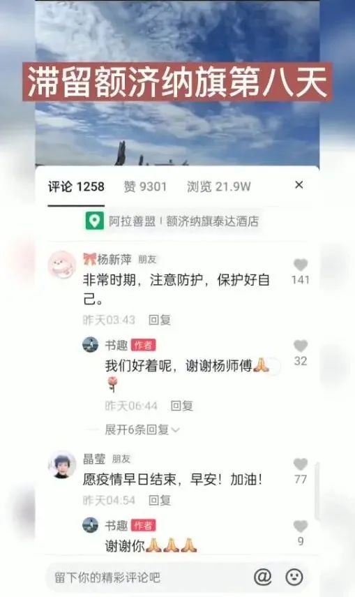 視頻發(fā)出數(shù)小時就吸引了上萬的瀏覽量。視頻發(fā)布者王女士在視頻中呈現(xiàn)一家人滯留額濟納旗現(xiàn)況的同時,也給和她同樣滯留額濟納旗的近萬名游客鼓勁:“如果你此時正在阿拉善,愿你如胡楊般堅強,積極應對疫情?!?/p>