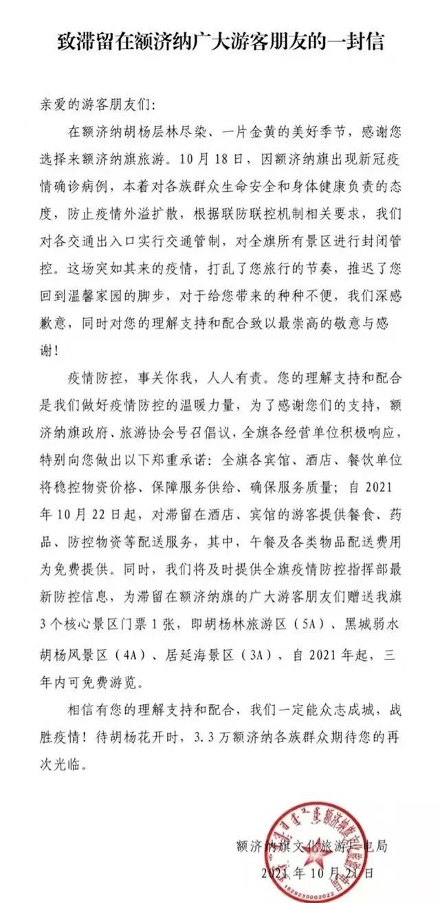 這封公開信中寫道,自10月22日起,對滯留在酒店、賓館的游客提供餐食、藥品、防控物資等配送服務,其中,午餐及各類物品配送費用為免費提供;為滯留游客贈送胡楊林旅游區(qū)(5A)、黑城弱水胡楊風景區(qū)(4A)、居延海景區(qū)(3A)3個核心景區(qū)門票1張,自2021年起,三年內可免費游覽。