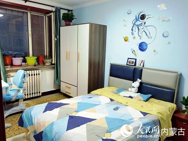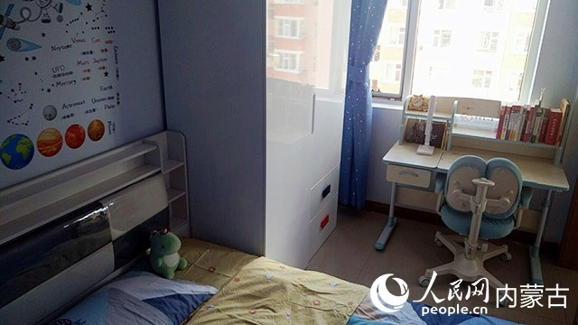 在對(duì)原有住房進(jìn)行規(guī)劃、設(shè)計(jì)后,施工隊(duì)開始裝修,并配備必要的家具、臥具和學(xué)習(xí)生活用品。歷時(shí)半個(gè)多月,一間以藍(lán)色為主色調(diào)的小屋建成了。現(xiàn)在,屬于浩博的那一半臥室,泛黃的臥室墻壁被粉刷成淡藍(lán)色,換了新的小床和衣柜,新添置的書桌上擺滿了課外書,看起來整潔又溫馨。