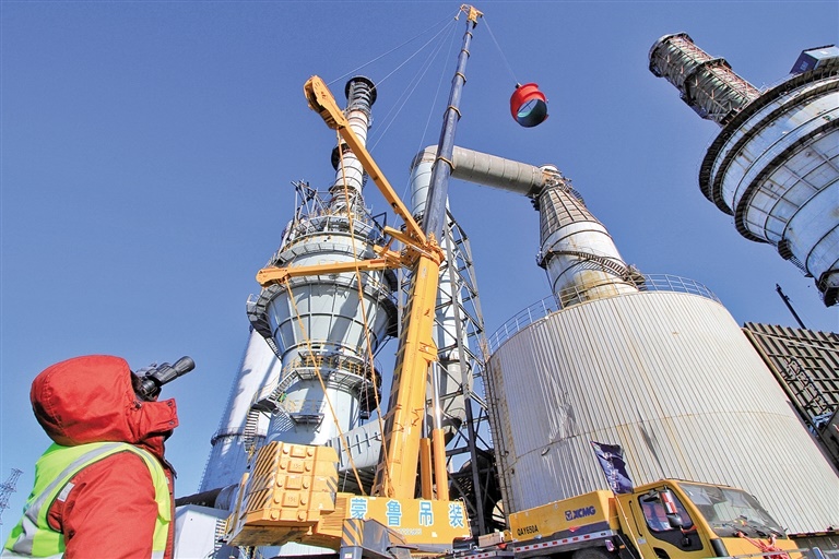 包鋼節(jié)能環(huán)保改造項目——脫硫塔筒吊裝現(xiàn)場。