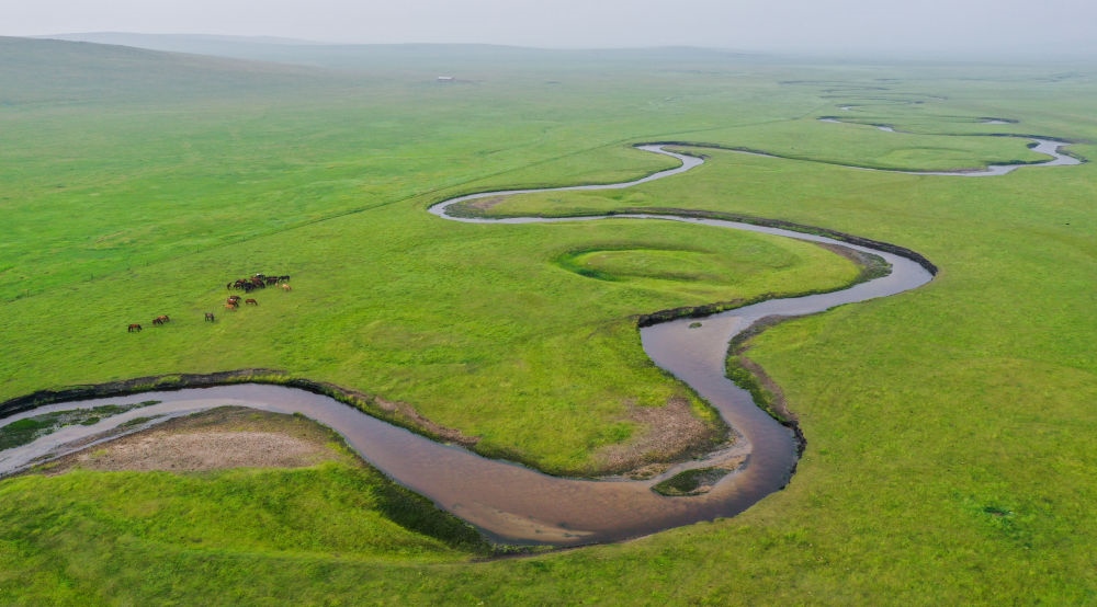 這是內(nèi)蒙古錫林郭勒盟東烏珠穆沁旗乃林高勒的草原風(fēng)光(2021年7月12日攝,無(wú)人機(jī)照片)。新華社記者連振攝