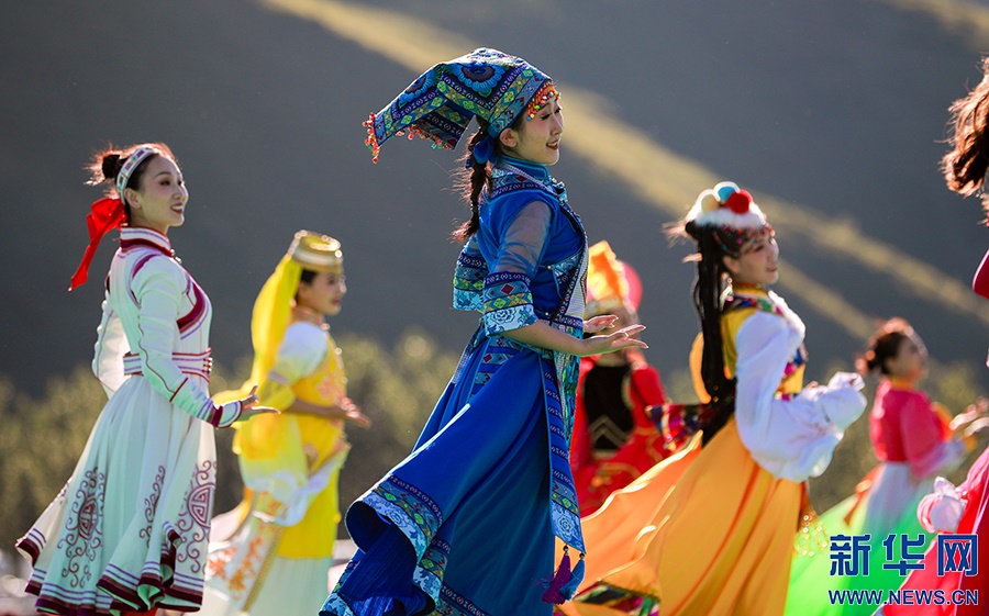 8月8日,烏蘭牧騎的隊員在開幕式上踏歌起舞。新華網(wǎng)發(fā)(丁根厚攝)