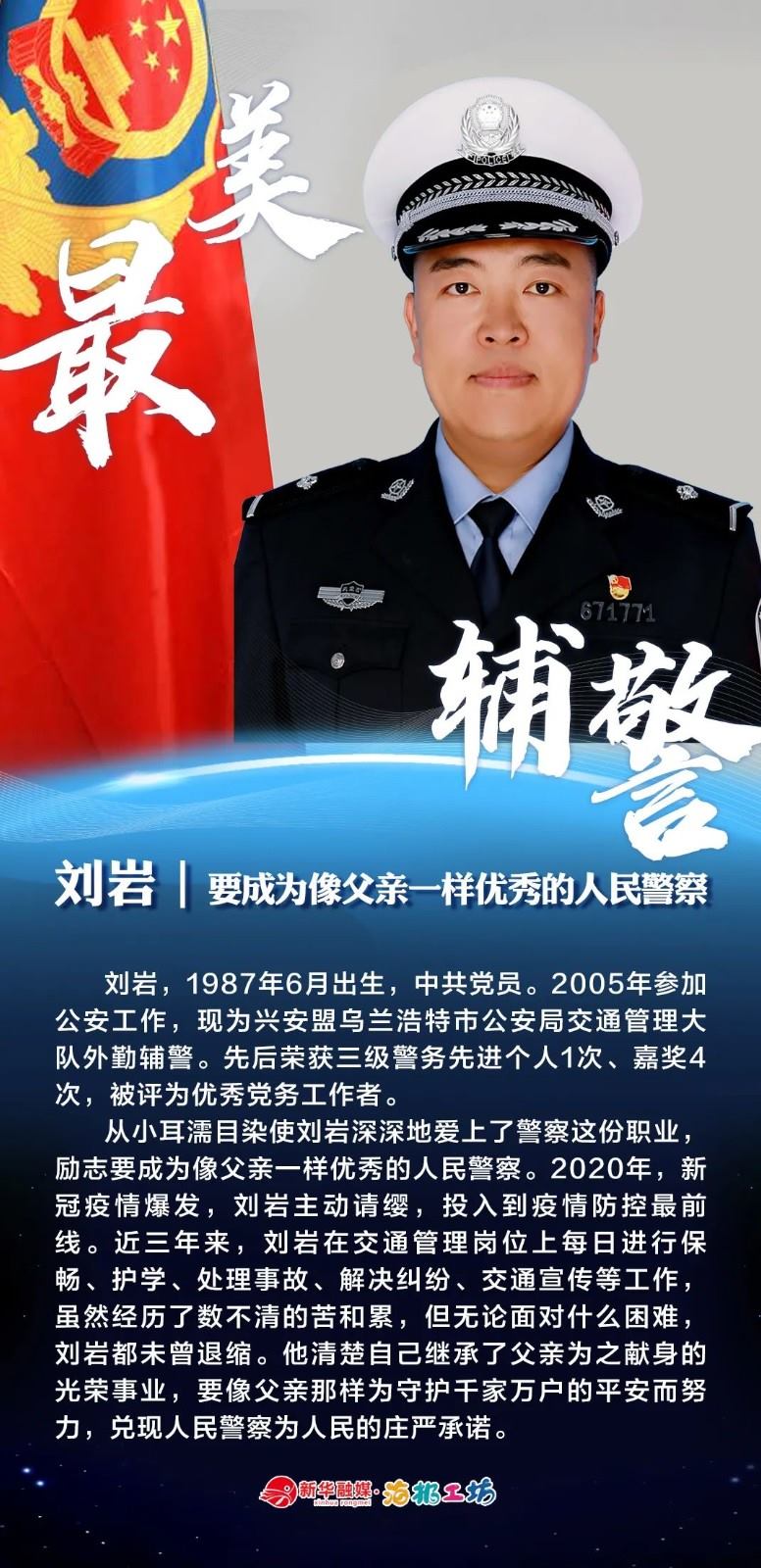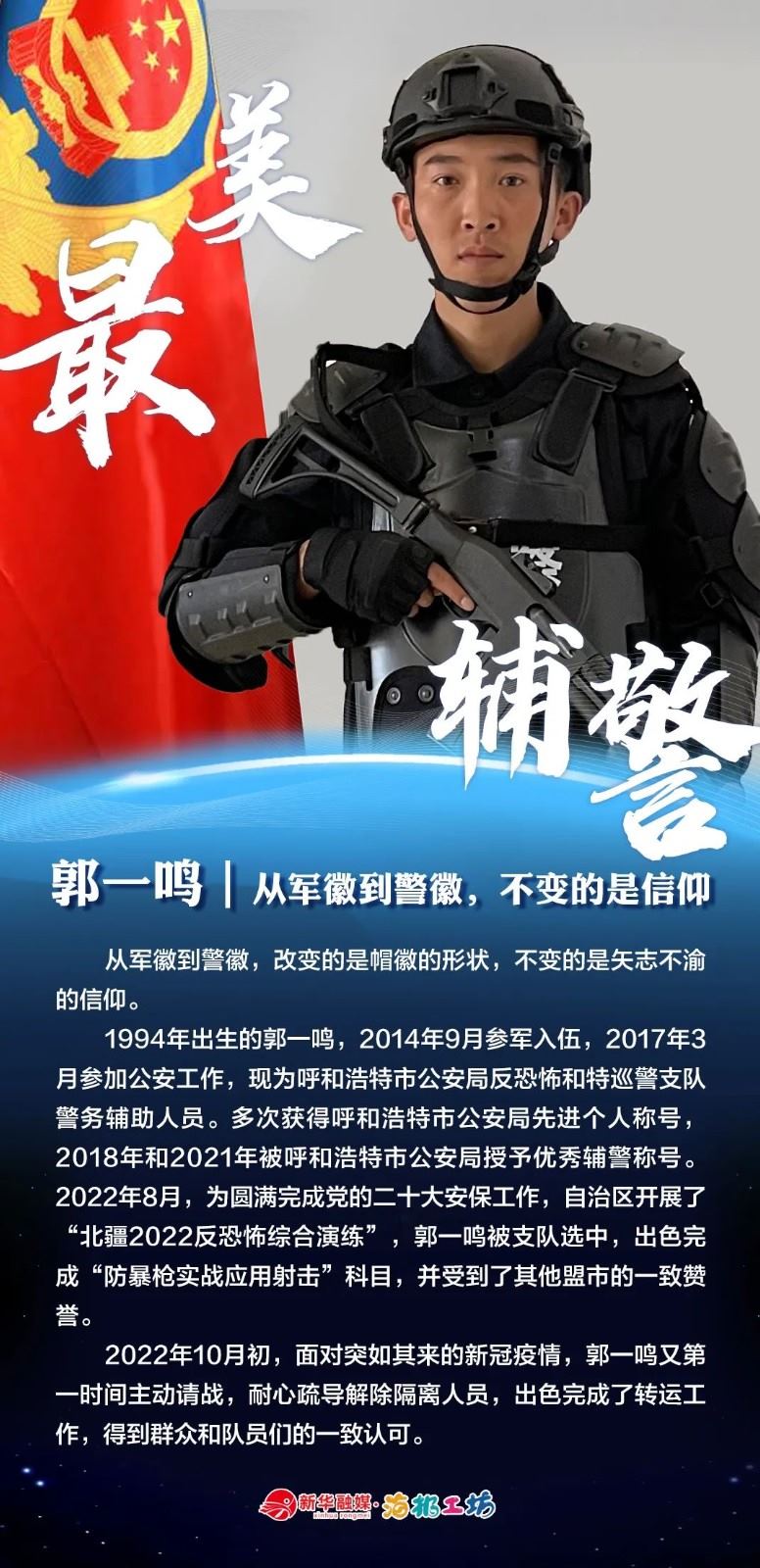 “不同的肩章,同樣的堅(jiān)守……”在“感動(dòng)北疆·最美輔警”獲獎(jiǎng)?wù)咧校?strong>有堅(jiān)守忠誠(chéng)的安全衛(wèi)士郭一鳴,對(duì)癥下藥的老片兒警康華,服務(wù)群眾的熱心人辛永紅,校園安全的“護(hù)航員”李璐瑤,社區(qū)警務(wù)“信息化管家”鄭威,警務(wù)支撐“小能手”胡建業(yè),110接處警“活地圖”劉順峰,網(wǎng)上巡查“質(zhì)檢員”王昊,基層交通安全“好聲音”劉巖,一線“智慧公安”排頭兵張?zhí)睢?/strong>