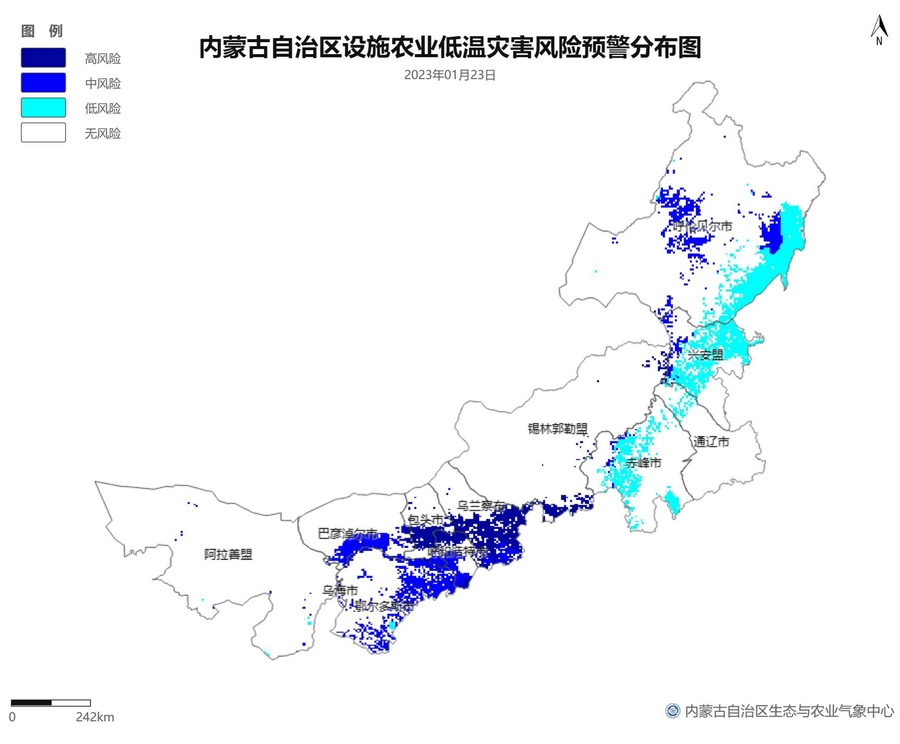 根據(jù)智能網(wǎng)格預(yù)報數(shù)據(jù),結(jié)合設(shè)施農(nóng)業(yè)低溫災(zāi)害和風(fēng)災(zāi)指標,1月21日至23日,呼倫貝爾市東南部、東南部偏西地區(qū)為設(shè)施農(nóng)業(yè)低溫災(zāi)害低風(fēng)險地區(qū),東北部中部及東部、中部偏南大部、西部偏東部分地區(qū)為設(shè)施農(nóng)業(yè)低溫災(zāi)害中或高風(fēng)險地區(qū),低溫災(zāi)害將導(dǎo)致作物生長緩慢和受凍;21至23日,東南部部分地區(qū)、中部偏西南局部地區(qū)及鄂爾多斯市零星地區(qū)為設(shè)施農(nóng)業(yè)風(fēng)災(zāi)低風(fēng)險地區(qū),其中,22日鄂爾多斯市北部零星地區(qū)、23日錫林郭勒盟東部零星地區(qū)、烏蘭察布市中部局部地區(qū)為設(shè)施農(nóng)業(yè)風(fēng)災(zāi)中或高風(fēng)險地區(qū),風(fēng)災(zāi)易造成溫室結(jié)構(gòu)受損。