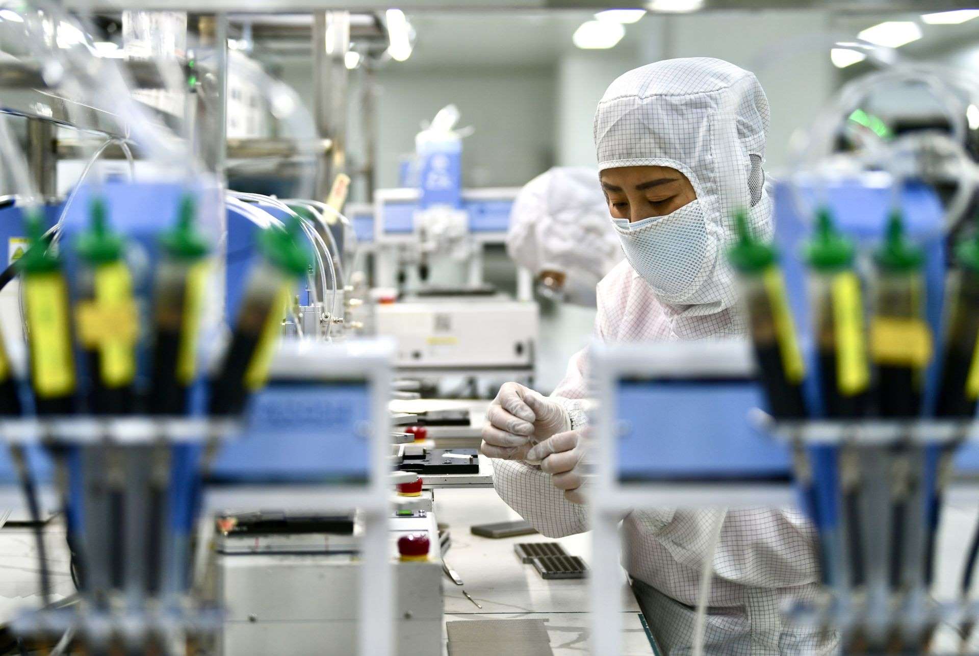 在包頭市稀土高新區(qū)大地熊(包頭)永磁科技有限公司生產(chǎn)車間內(nèi),技術(shù)人員查看設(shè)備運行情況。