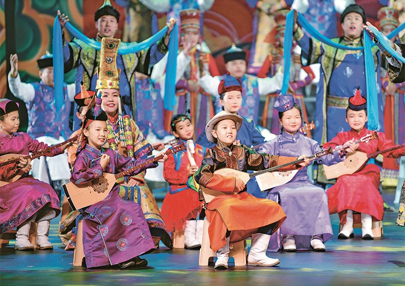2022年9月4日,第八屆全國少數(shù)民族曲藝展演在內(nèi)蒙古自治區(qū)鄂爾多斯市開演。圖為演員在展演中表演蒙古族祝贊詞《禮贊新時(shí)代》。 人民圖片