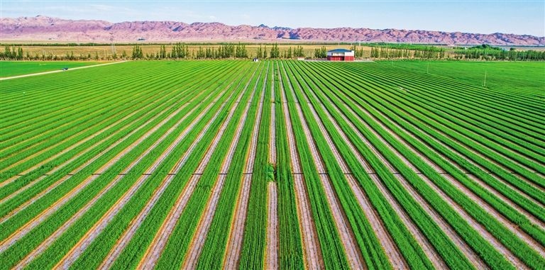 從空中俯瞰,現(xiàn)代農(nóng)業(yè)示范園區(qū)內(nèi),萬(wàn)畝大田宛如一塊綠色的巨型“畫(huà)布”。