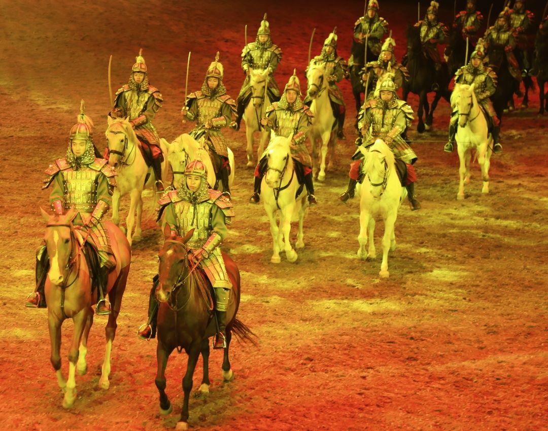 蒙古馬、汗血寶馬、盧西塔諾、弗里斯蘭、安達(dá)盧西亞、德保矮馬、阿拉伯馬等百余匹名馬、百名騎手組成龐大陣容的表演,整場(chǎng)演出恢宏震撼,充滿視覺(jué)沖擊力。
