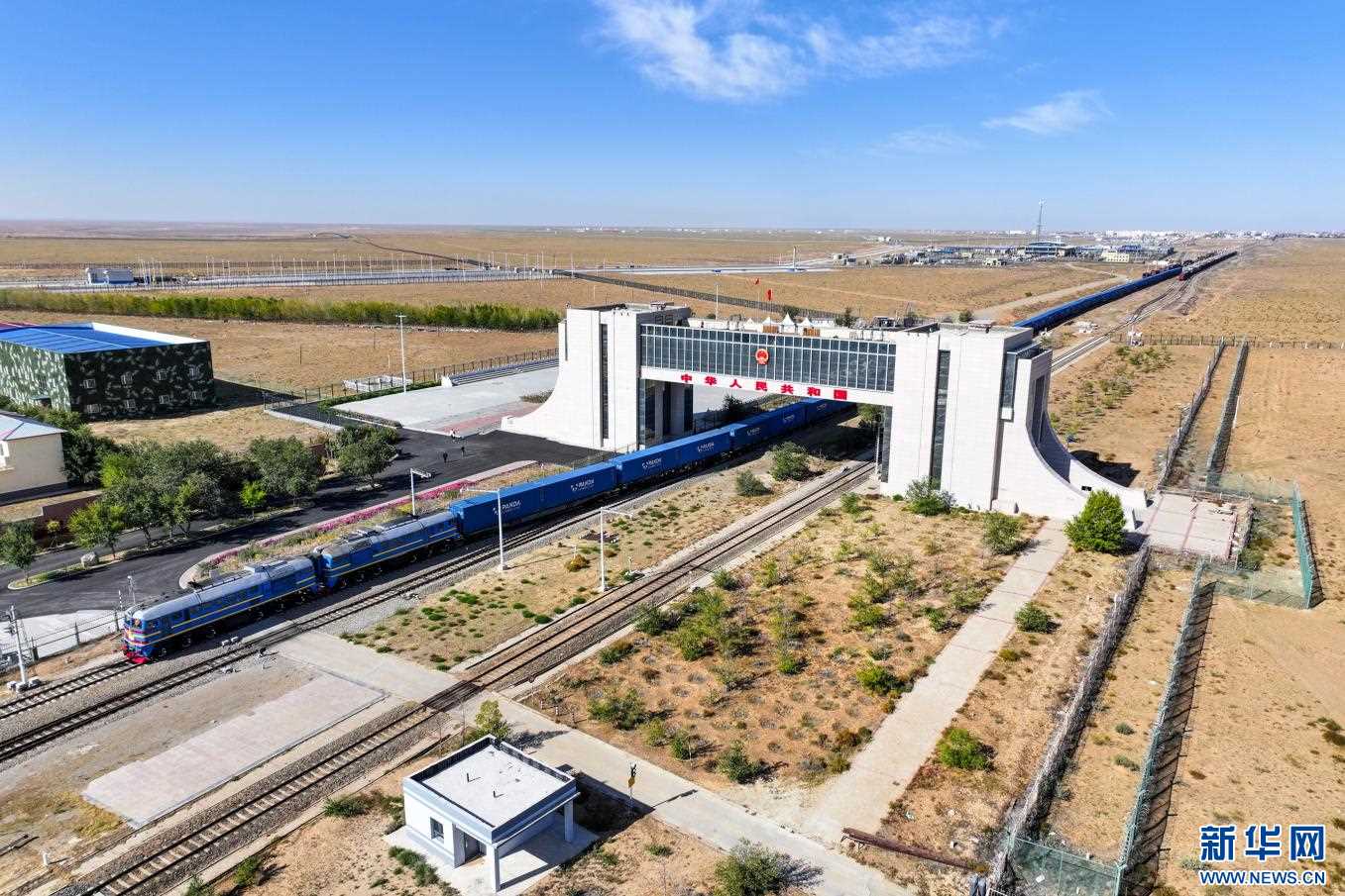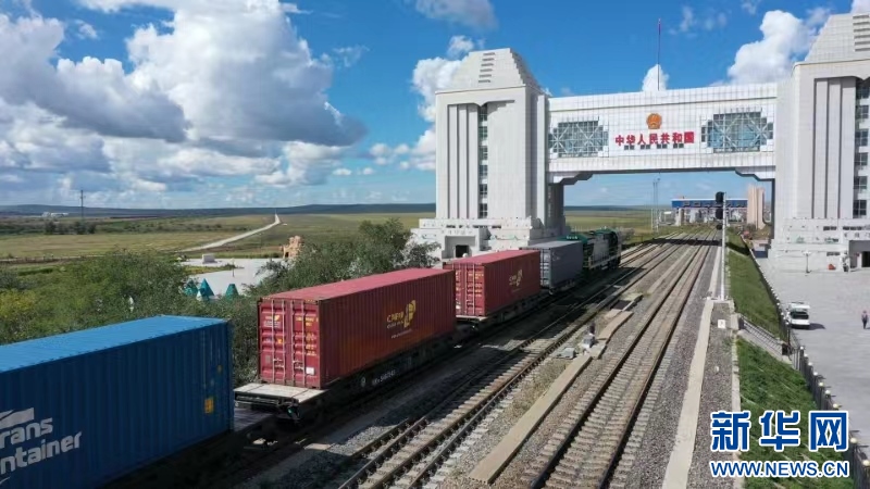 中歐班列駛出滿洲里國(guó)門。新華網(wǎng)發(fā) (李新軍 攝)