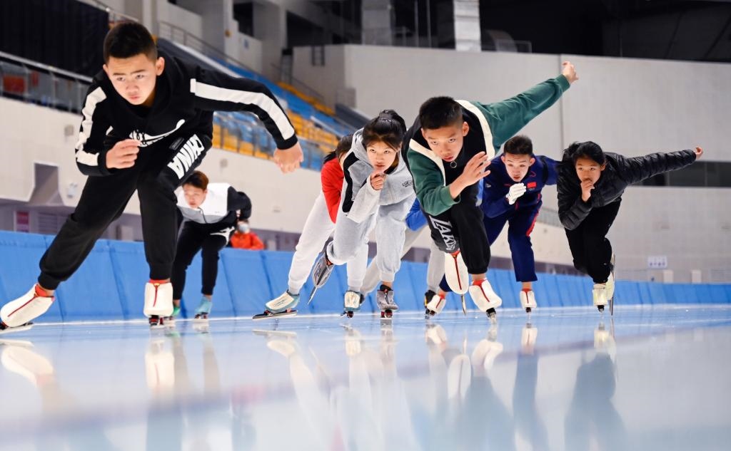 ??呼倫貝爾學院冰雪運動專業(yè)學生正在進行滑冰訓練。新華社記者 賀書琛 攝