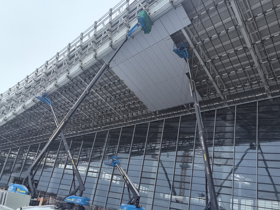 在新機(jī)場(chǎng)項(xiàng)目航站樓施工現(xiàn)場(chǎng),工作人員正在有序地進(jìn)行內(nèi)部裝修,航站樓內(nèi)部空間雛形已現(xiàn)。