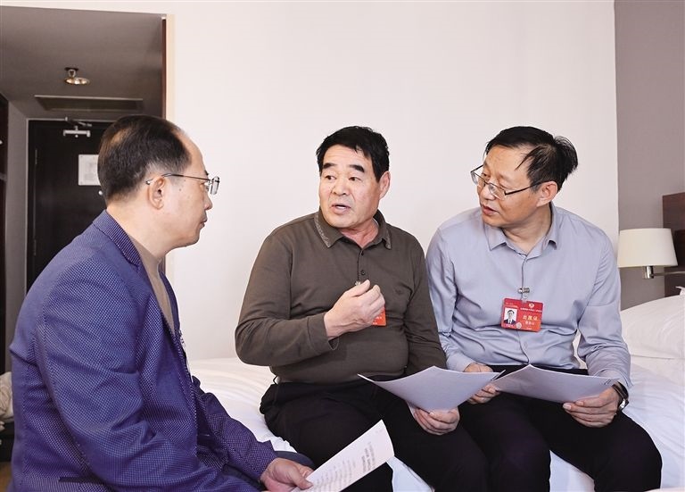 3月4日,住我區(qū)全國政協(xié)委員阿拉騰達(dá)來(左)、廷·巴特爾(中)、曹金山(右)在住地,就進(jìn)一步提高草原生態(tài)保護(hù)補(bǔ)助獎(jiǎng)勵(lì)標(biāo)準(zhǔn),為打贏“三北”工程攻堅(jiān)戰(zhàn)和三大標(biāo)志性戰(zhàn)役奠定政策基礎(chǔ)的提案進(jìn)行討論。草原全媒·內(nèi)蒙古新聞網(wǎng)記者 韓卿立 攝