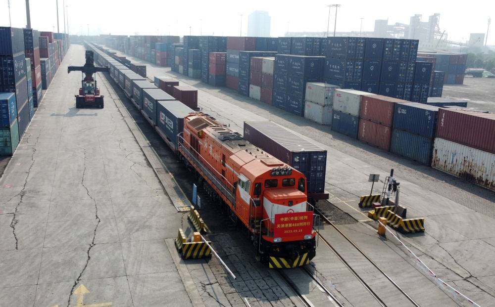 2023年9月18日,一列發(fā)往蒙古國(guó)烏蘭巴托的中歐(中亞)班列駛出天津港物捷三堆場(chǎng)(無(wú)人機(jī)照片)。