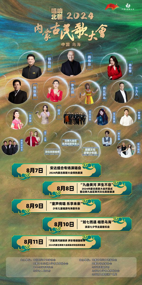 2024內(nèi)蒙古民歌大會(huì)的主舞臺(tái)坐落在烏海湖畔,為期5天的民歌之旅,分別以“2024內(nèi)蒙古民歌大會(huì)預(yù)熱展演——安達(dá)組合專場(chǎng)音樂(lè)會(huì)”“九曲黃河 聲生不息——2024內(nèi)蒙古民歌大會(huì)開幕式暨沿黃九省區(qū)黃河文化民歌展演”“童聲傳唱 樂(lè)享未來(lái)——少年兒童唱游烏海音樂(lè)會(huì)”“如七而遇 相思烏?!寺呦?jié)主題音樂(lè)會(huì)”“萬(wàn)里黃河披錦繡 多彩奇緣踏歌來(lái)——2024內(nèi)蒙古民歌大會(huì)閉幕式特色民歌展演”為主題,節(jié)目形式兼顧地域?qū)傩院兔窀璺N類,涵蓋原生民歌、經(jīng)典民歌、創(chuàng)編民歌,充分展示各民族、各地域特色民歌的獨(dú)特魅力。