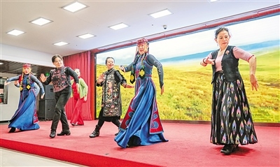 11月12日,烏蘭牧騎隊(duì)員在北京市西城區(qū)德勝街道辦事處與群眾一同跳舞。當(dāng)日,內(nèi)蒙古自治區(qū)直屬烏蘭牧騎攜包頭市達(dá)茂旗烏蘭牧騎、鄂爾多斯市伊金霍洛旗烏蘭牧騎開展“紅色文藝輕騎兵 烏蘭牧騎在北京”——北疆文化神州行文藝演出活動。據(jù)了解,此次烏蘭牧騎進(jìn)京演出活動,從11月6日至17日,在北京的民族文化宮為觀眾奉獻(xiàn)33場精彩的演出,同時(shí)還將走進(jìn)社區(qū)和學(xué)校開展多場演出活動。 (記者 王磊 攝)