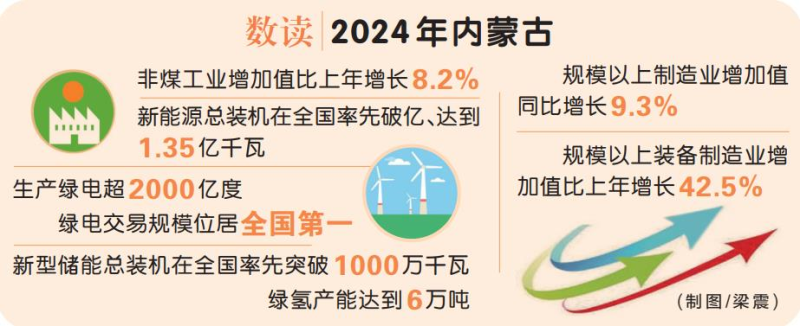 內(nèi)蒙古以新能源全產(chǎn)業(yè)鏈發(fā)展為牽引推進產(chǎn)業(yè)結(jié)構(gòu)優(yōu)化升級,下大氣力培育非煤、非資源型產(chǎn)業(yè),以新動能促進新發(fā)展,2024年,全區(qū)非煤工業(yè)增加值比上年增長8.2%。