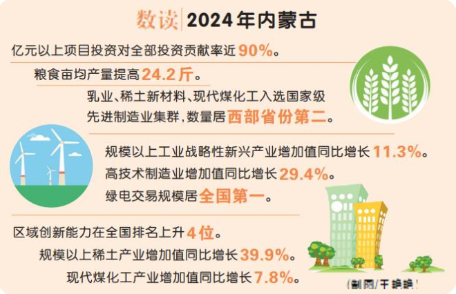 新賽道上,受益于高質量重大項目帶動,2024年,自治區(qū)綠電交易規(guī)模居全國第一;“蒙科聚”平臺技術合同成交額同比增長33.6%,全區(qū)凈增科技型中小企業(yè)853家、高新技術企業(yè)97家、科技領軍企業(yè)20家,乳業(yè)、稀土、氫、儲等領域取得一批填補行業(yè)空白的技術突破,我區(qū)區(qū)域創(chuàng)新能力在全國排名上升4位;全區(qū)規(guī)模以上新能源及相關產業(yè)增加值同比增長20.1%,規(guī)模以上工業(yè)戰(zhàn)略性新興產業(yè)增加值同比增長11.3%,高技術制造業(yè)增加值同比增長29.4%……推動新興產業(yè)“強筋壯骨”、未來產業(yè)加速培育,內蒙古落子如飛!