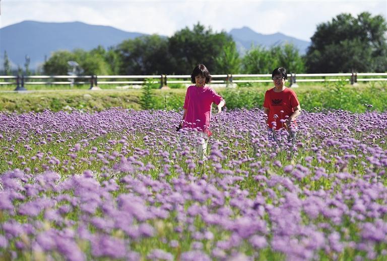 市民在大青山腳下的花海中漫步