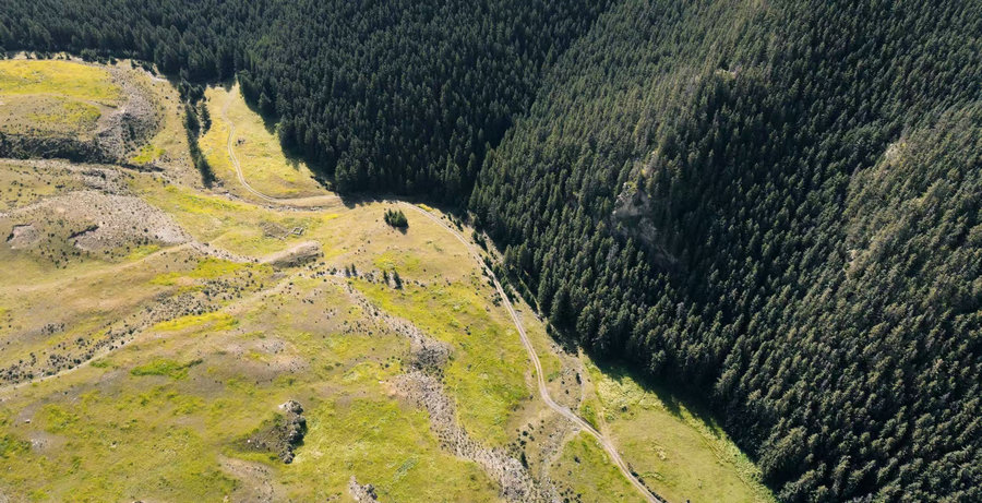 航拍視角下的山林與草甸過(guò)渡帶