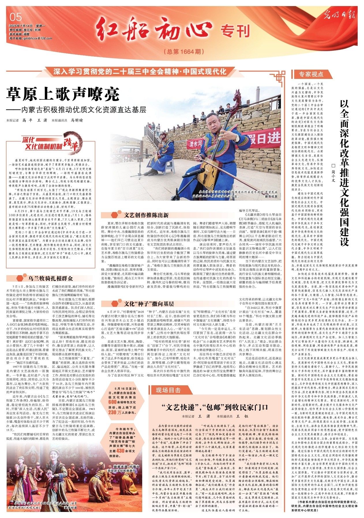 2025年7月14日,《光明日報》第5版刊發(fā)題為《草原上歌聲嘹亮——內(nèi)蒙古積極推動優(yōu)質文化資源直達基層》的文章,報道了盛夏時節(jié),地處祖國北疆的內(nèi)蒙古,千里草原綠浪如茵。一場場藝術盛宴連續(xù)登場,賦予了草原更多魅力、更強活力。